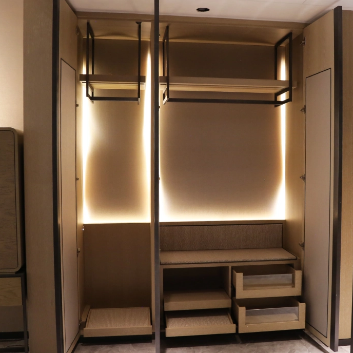 Выберите наш отель, оборудованный отель, чтобы обеспечить практичность, не жертвуя стилем. Больше, чем просто хранение, он воплощает в себе утонченное гостеприимство. Сотрудничайте с нами, чтобы спроектировать шкафы, которые соответствуют бренду вашего отеля, предлагая гостям плавный, стильный опыт хранения. Повысьте функциональность вашего отеля и эстетическую привлекательность нашими решениями для гардероба.